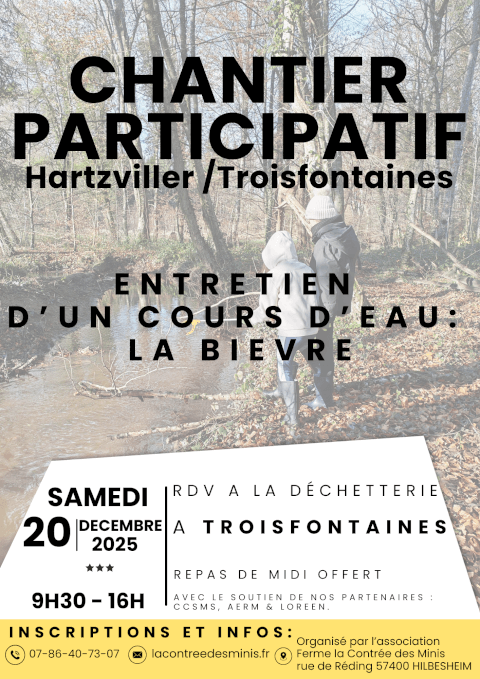 Venez nous aider à entretenir la Bièvre. 📅 Quand ? Samedi 20 décembre, de 9h30 à 16h 📍 Où ? RDV sur le parking de la déchetterie de Troisfontaines 👥 Pour qui ? Ouvert à tous les âges ! Venez en famille, entre amis ou en solo. ⚙️ À prévoir : - Tenue adaptée à la météo et au chantier 🍽️ Bonus : Repas offert le samedi midi. ✍️ Inscriptions obligatoires (places limitées) Avec le soutien de nos partenaires : CCSMS, REGION GE, AERM & LorEEN.