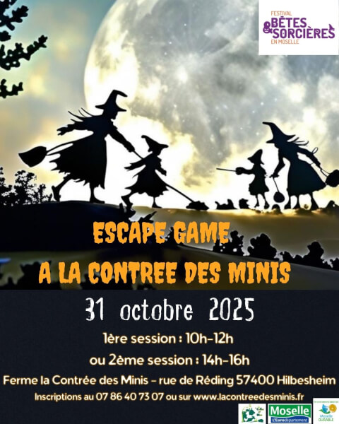 Un étrange brouillard s’est abattu sur la Contrée des Minis, une ferme nichée au cœur de la Moselle…Un groupe de sorcières, protectrices des plantes, des animaux et des secrets de la nature, s’y est installé provisoirement, en attendant de rejoindre un lieu caché où doit se tenir une grande fête magique. Mais leur présence inquiète les gardiens de la vallée, qui craignent leurs pouvoirs et les soupçonnent de mauvaises intentions… À vous de fouiller chaque recoin de la Contrée des Minis, de résoudre les énigmes et de prouver que ces sorcières ne veulent que le bien. Parviendrez-vous à lever le doute et leur permettre de poursuivre leur mission magique ? Vous aurez environ 90 minutes... Et après l’effort, le réconfort… Nous vous inviterons à déguster des produits locaux et bio. Venez vivre cette expérience seul, entre amis, en famille ou en couple ! Et n'hésitez pas à vous déguiser ! Certaines énigmes peuvent être complexes, merci d'accompagner les enfants. (Escape game conseillé dès 6-7 ans) INSCRIPTION OBLIGATOIRE Animation en extérieur, merci de prévoir une tenue adaptée. Pour votre déplacement, profitez d'une solution économique et écologique avec BlaBlaCar Daily. Depuis janvier 2025, la Communauté de Communes Sarrebourg Moselle Sud vous propose un covoiturage gratuit, tout frais payé, sur le territoire. Avec le soutien du Département de la Moselle. Labellisation de notre évènement écoévénement Moselle durable niveau or.