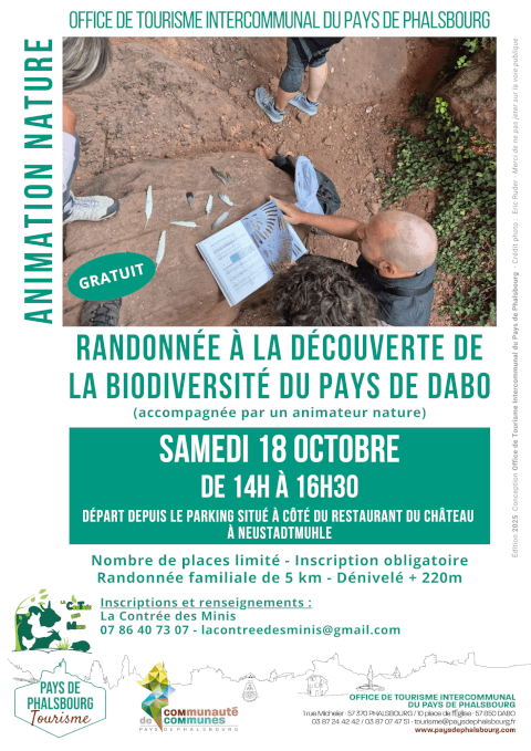 Venez vivre une expérience en pleine nature ! Au cours d’une randonnée guidée, découvrez la faune, la flore et les paysages exceptionnels du Pays de Dabo. Une sortie enrichissante pour petits et grands, dans un cadre naturel splendide. Prévoir une tenue adaptée à la météo. RDV au parking à côté du restaurant du château à Neustadtmuhle (Dabo) INSCRIPTION OBLIGATOIRE Crédits photo : E. Ruder